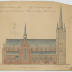 Opschrift: Parochiale kerk van St. Amandus te Gheel. Ontwerp tot de uitwendige herstelling. Eglise paroissiale de St. Amand à Gheel. Projet de restauration extérieure. Omschrijving plan: opstand N-gevel Datum KCML: 11/05/1907 Archiefnummer: A0632