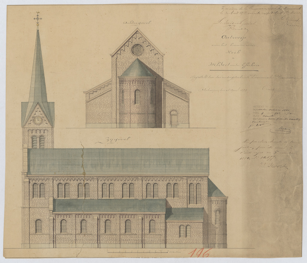 Opschrift: Ontwerp voor het bouwen eener kerk te Wildert onder Esschen. Omschrijving plan: opstand achtergevel, opstand zijgevel Datum KCML: 30/08/1879 Archiefnummer: A0628