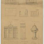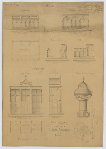 Opschrift: Ameublement de l'église de Liezel-Steelen sous Gheel. Omschrijving plan: plattegrond, voor- en zijaanzicht biechtstoel, plattegrond, voor- achter- en zijaanzicht en doorsnede koorgestoelte, plattegrond en vooraanzicht doopvont Datum KCML: 29/05/1874 Archiefnummer: A0692