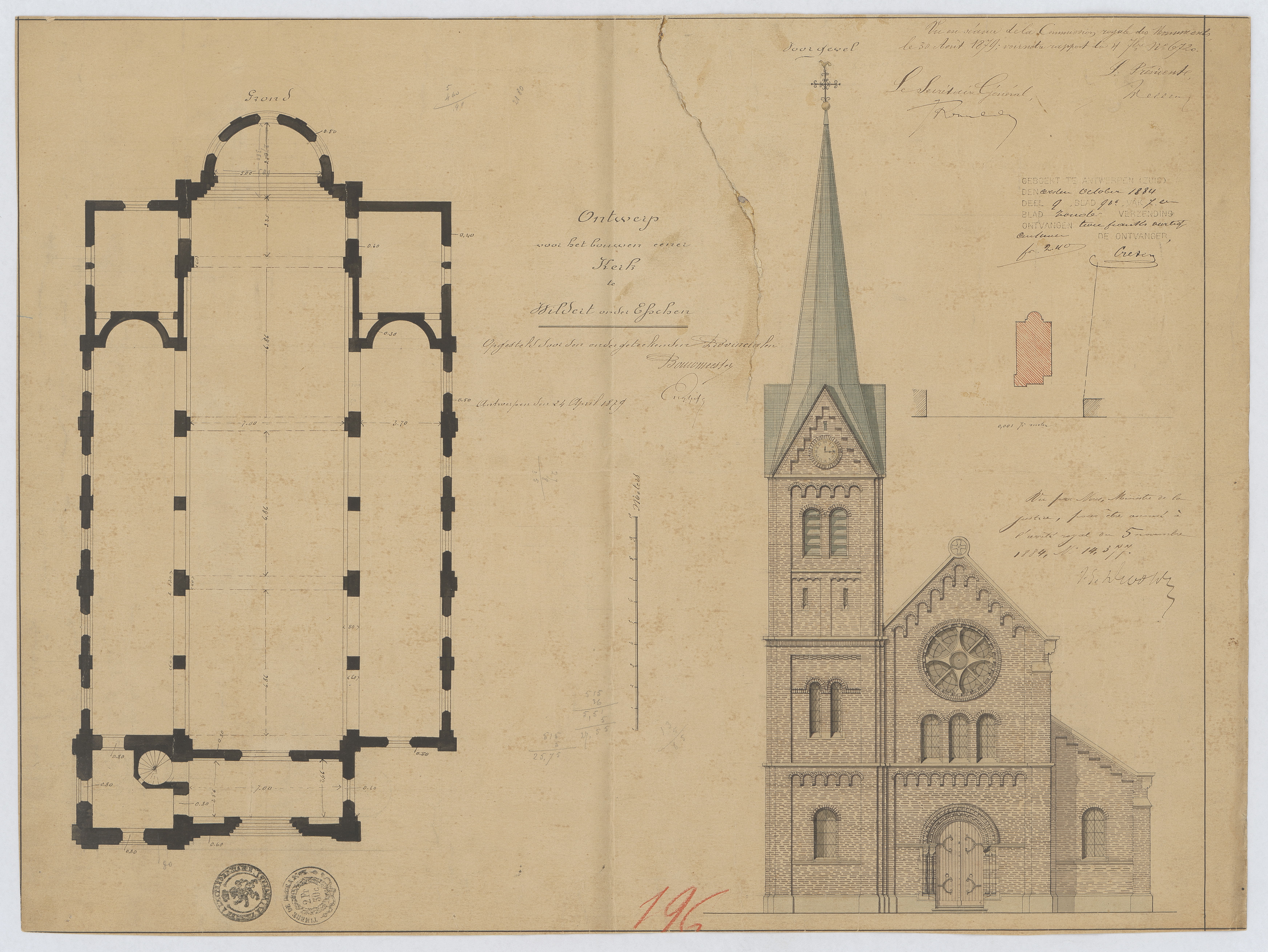 Opschrift: Ontwerp voor het bouwen eener kerk te Wildert onder Esschen. Omschrijving plan: opstand voorgevel, situatieplan, plattegrond niveau 0 Datum KCML: 30/08/1879 Archiefnummer: A0626