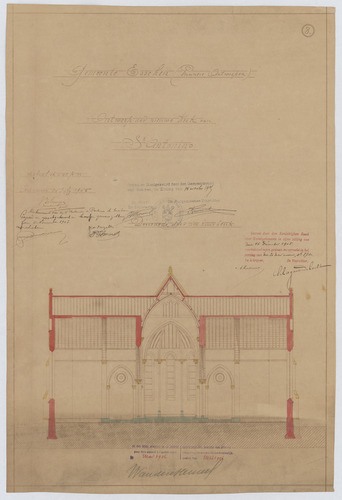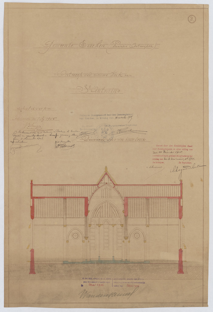 Opschrift: Gemeente Esschen (provincie Antwerpen). Ontwerp der nieuwe kerk St.-Antonius. Omschrijving plan: dwarsdoorsnede, doorsnede naar het koor Datum KCML: 16/12/1905 Archiefnummer: A0621