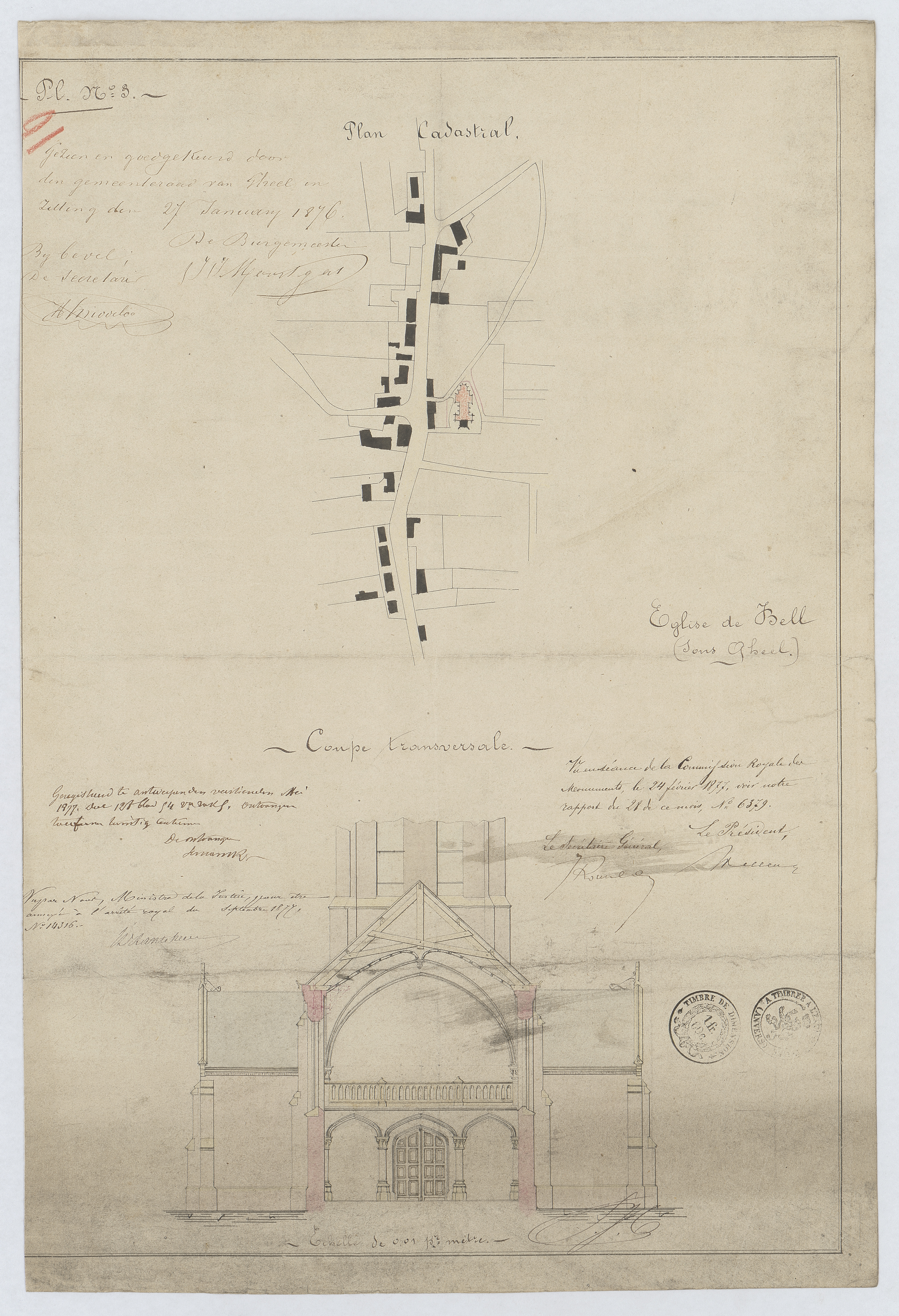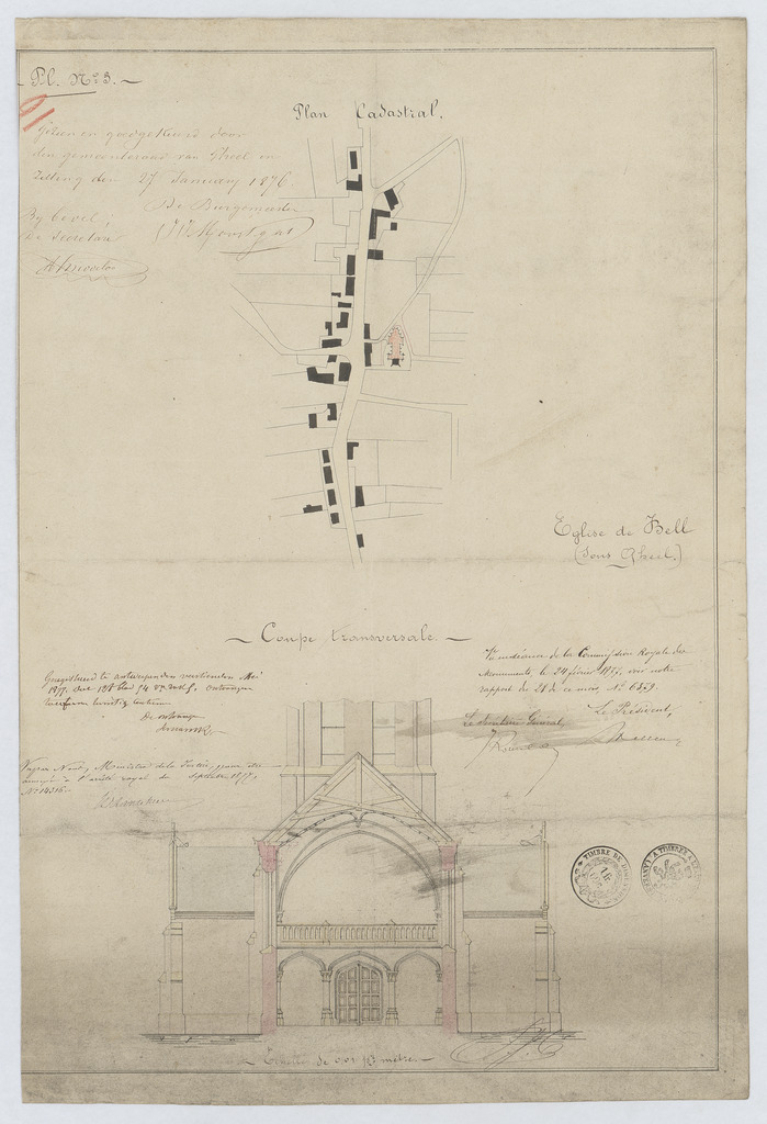 Opschrift: l'Eglise de Bell (sous Gheel). Omschrijving plan: situatieplan, dwarsdoorsnede Datum KCML: 24/02/1877 Archiefnummer: A0659