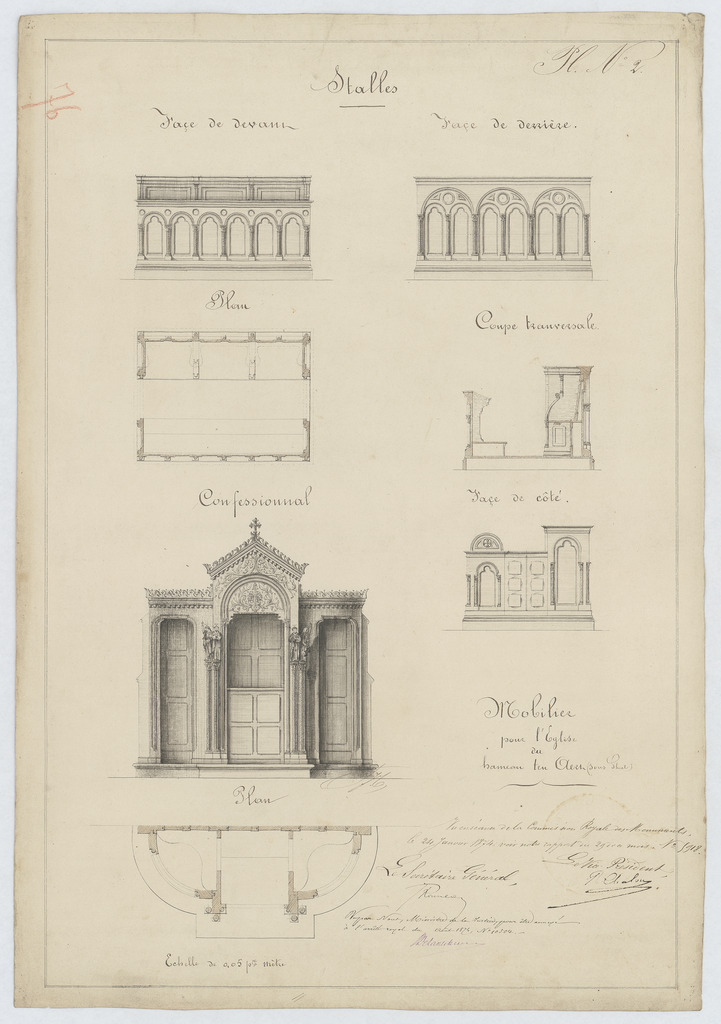 Opschrift: Mobilier pour l'Eglise du hameau ten Aert (sous Gheel). Omschrijving plan: plattegrond, voor-, achter- en zijaanzicht en doorsnede koorgestoelte, plattegrond en vooraanzicht biechtstoel Datum KCML: 24/01/1874 Archiefnummer: A0699