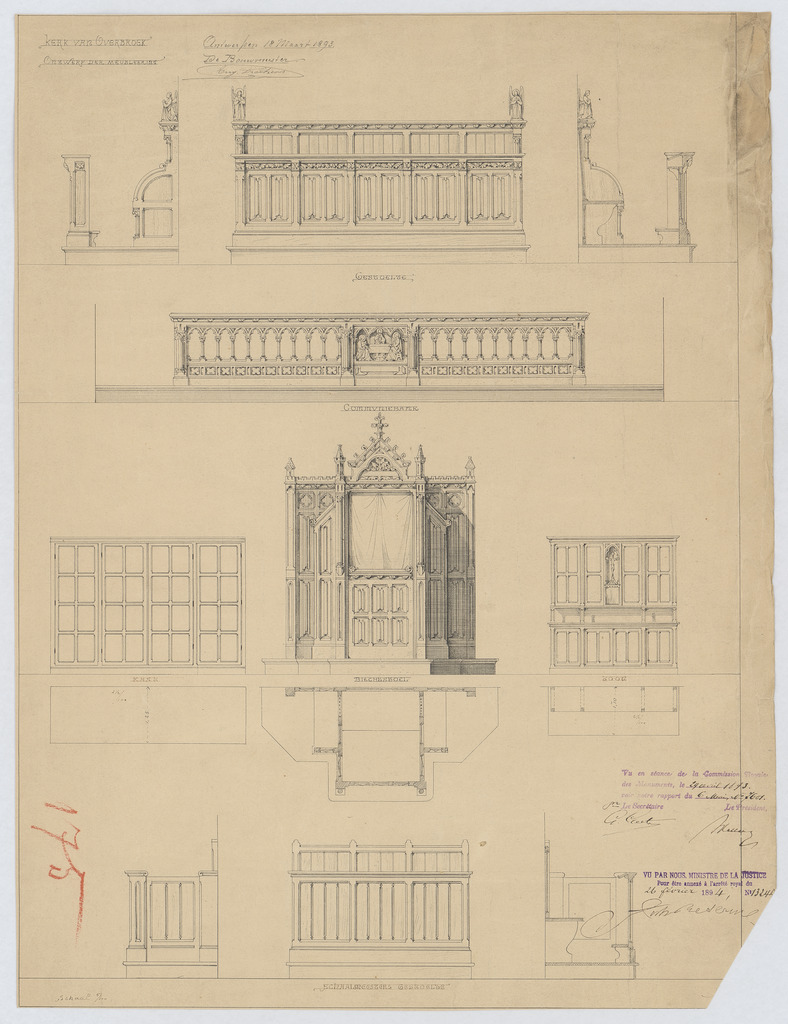 Opschrift: Kerk van Overbroek. Ontwerp der meubleering. Omschrijving plan: voor- en zijaanzicht, doorsnede koorgestoelte, vooraanzicht communiebank, plattegrond en aanzicht biechtstoel, plattegrond en vooraanzicht toog, plattegrond en vooraanzicht kast, plattegrond, voor- en zijaanzicht schaalmeestersgestoelte Datum KCML: 29/04/1893 Archiefnummer: A0608