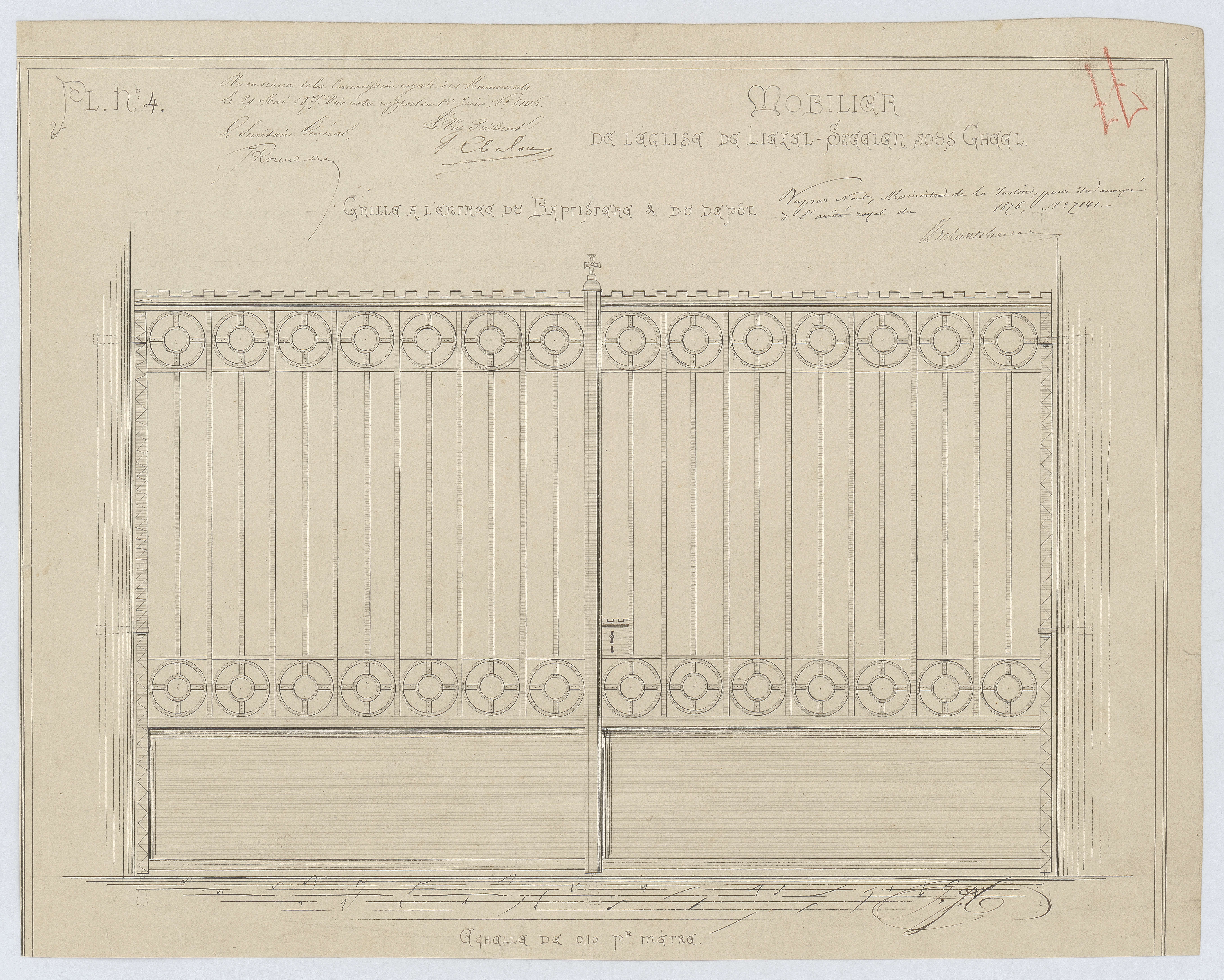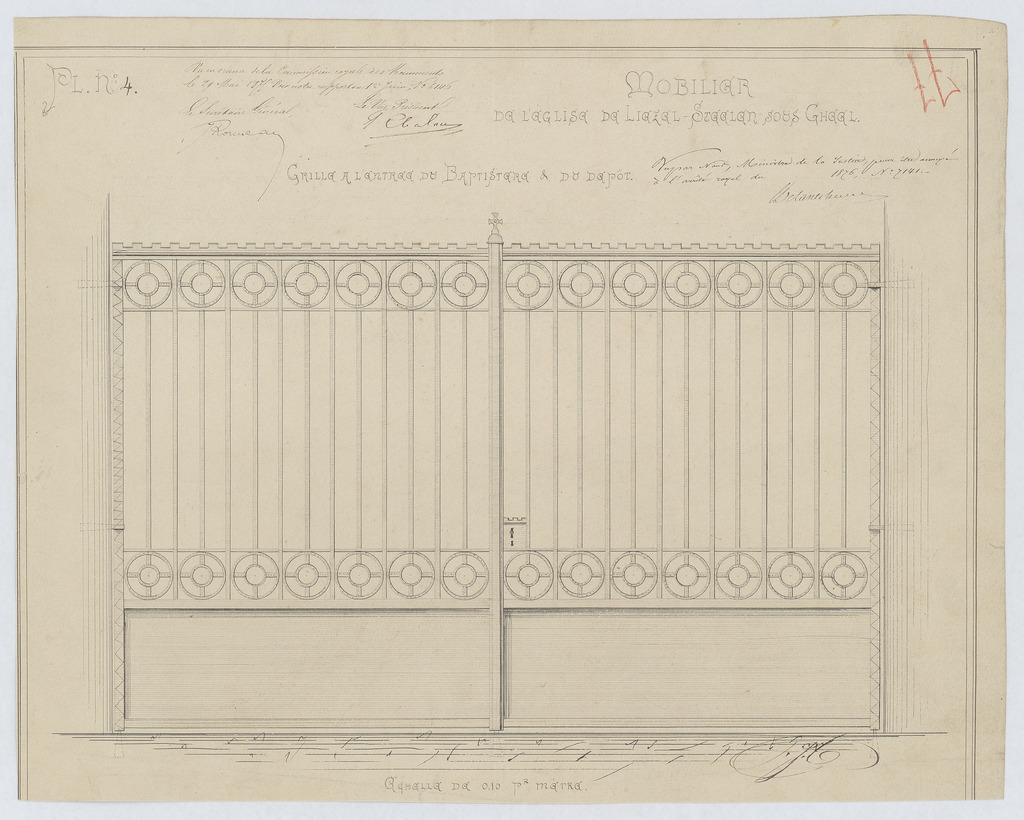 Opschrift: Mobilier de l'église de Liezel-Steelen sous Gheel. Grille à l'entree du baptistère & du depot. Omschrijving plan: aanzicht hek Datum KCML: 29/05/1874 Archiefnummer: A0694