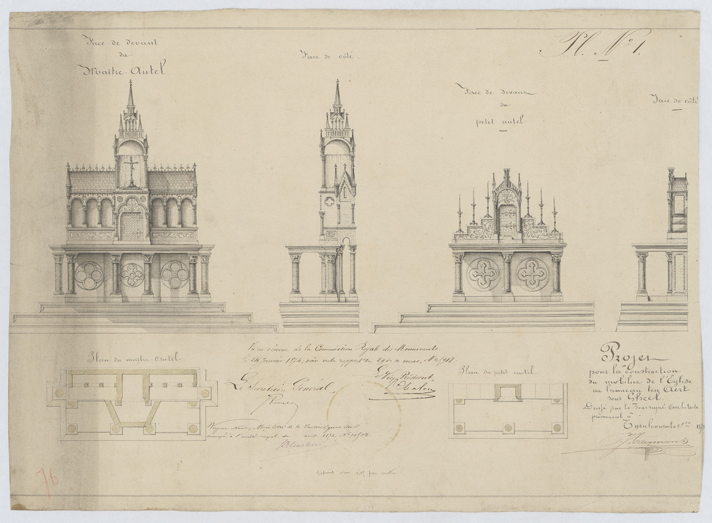 Opschrift: Projet pour la constuction du mobilier de l'Eglise au hameau ten Aert sous Gheel. Omschrijving plan: plattegrond, voor- en zijaanzicht hoofd- en zijaltaar Datum KCML: 24/01/1874 Archiefnummer: A0698