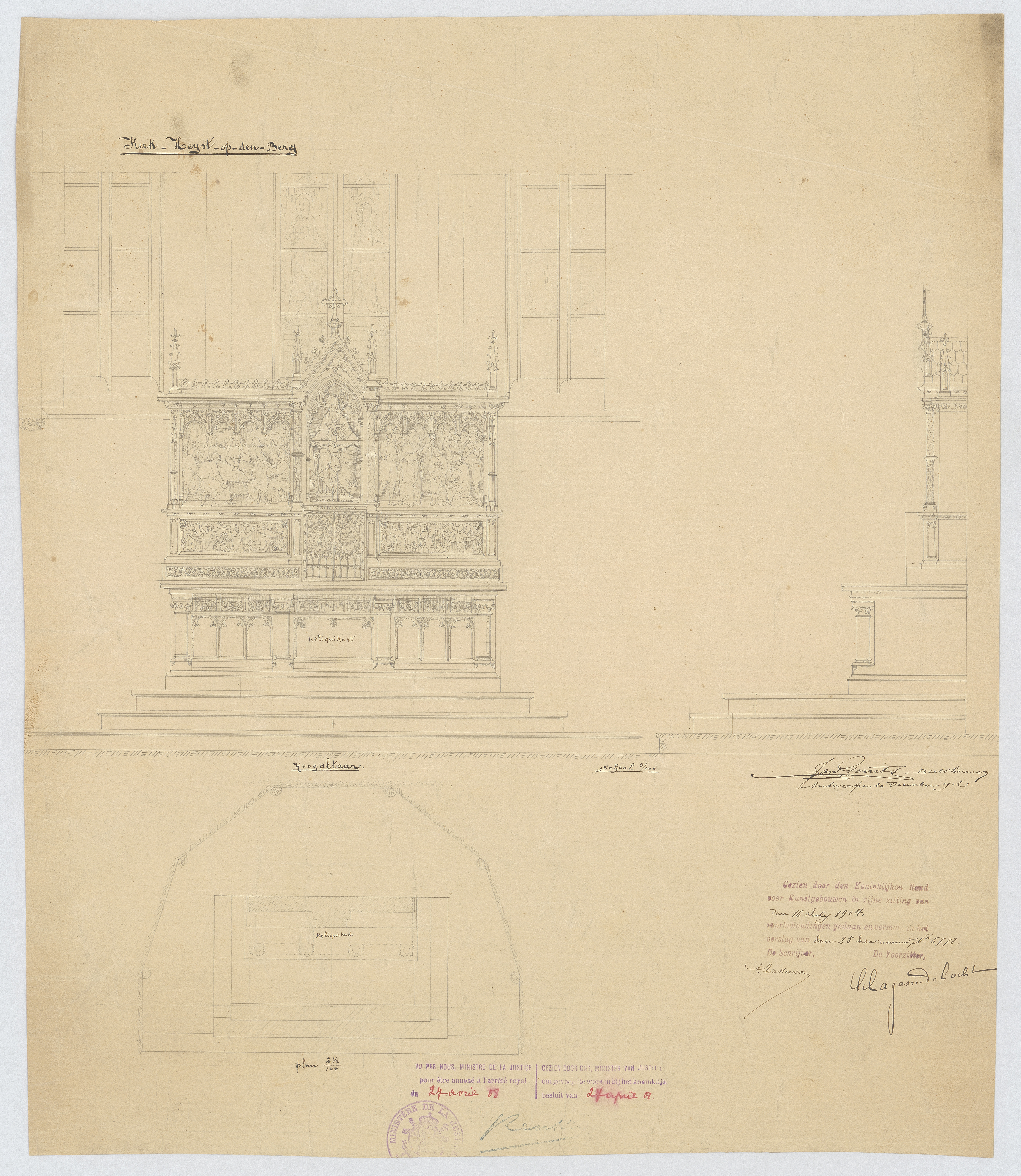 Opschrift: Kerk-Heyst-op-den-berg. Omschrijving plan: plattegrond, voor- en zijaanzicht hoofdaltaar Datum KCML: 16/07/1904 Archiefnummer: A0722