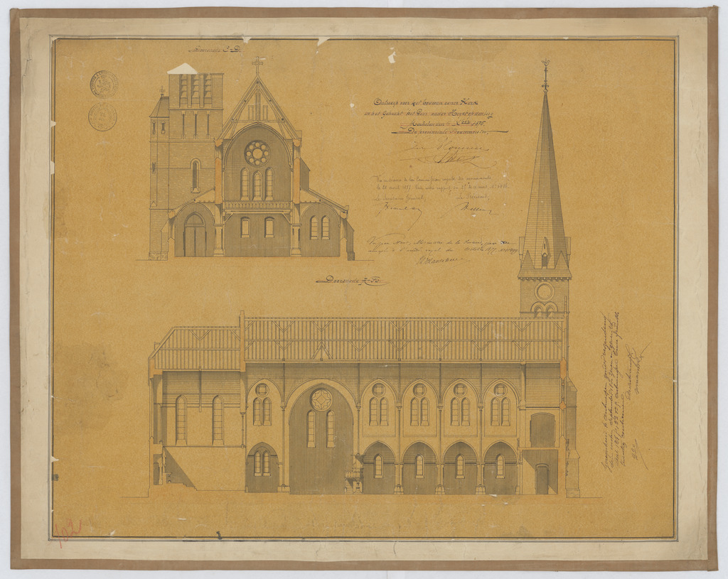 Opschrift: Ontwerp voor het bouwen eener Kerk in het gehucht 'het Goor' onder Heyst op den berg. Omschrijving plan: langsdoorsnede, dwarsdoorsnede Datum KCML: 21/04/1877 Archiefnummer: A0731