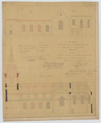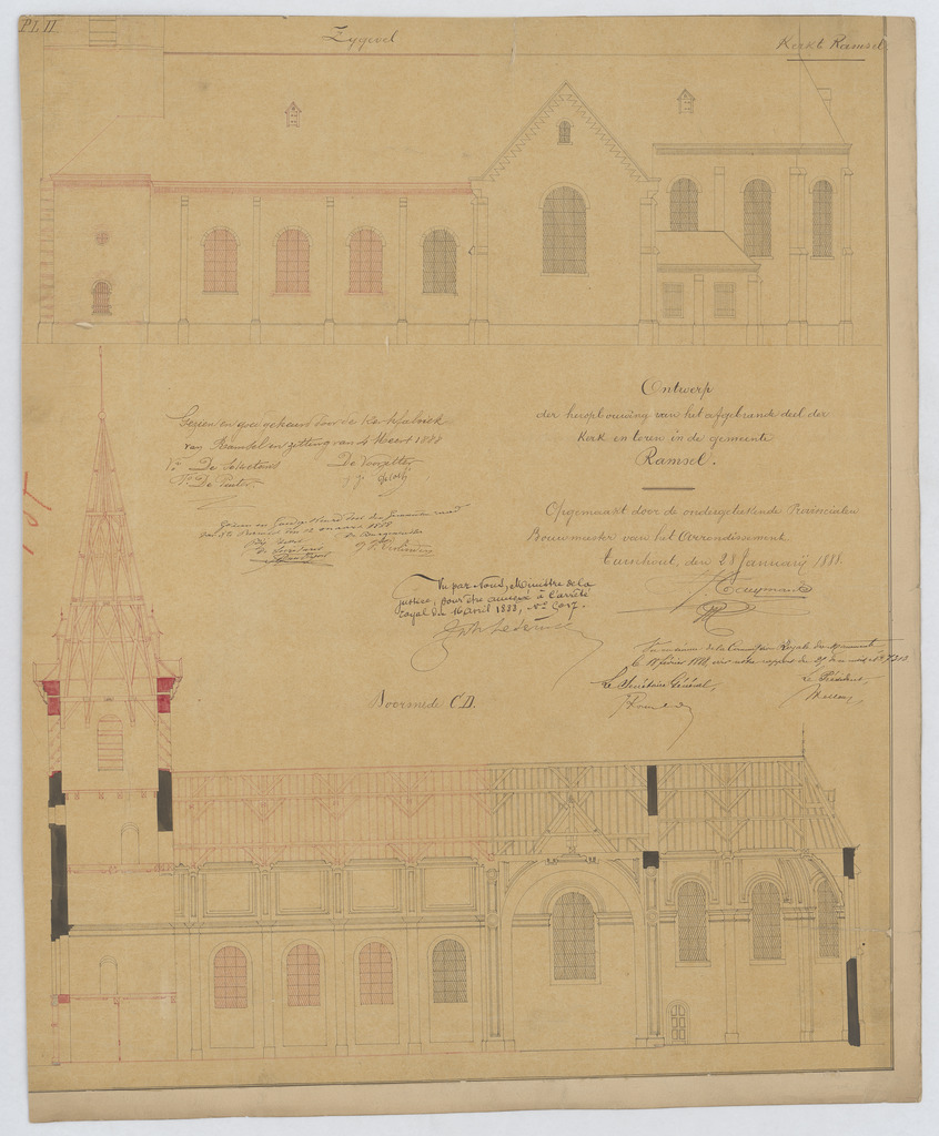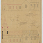 Opschrift: Ontwerp der heropbouwing van het afgebrande deel der kerk en toren in de gemeente Ramsel. Omschrijving plan: opstand zijgevel 1, langsdoorsnede Datum KCML: 18/02/1888 Archiefnummer: A0783