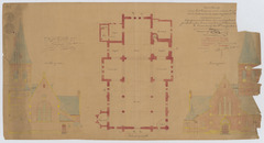 Opschrift: Ontwerp voor het bouwen eener nieuwe kerk te Winkelomheide onder de gemeente Gheel. Omschrijving plan: plattegrond niveau 0, opstand voorgevel, opstand achtergevel Datum KCML: 11/11/1905 Archiefnummer: A0710