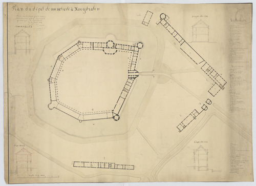 Opschrift: Plan du dépot de meneticeté à Hoogstraten. Omschrijving plan: situatieplan, doorsneden Datum KCML: deze informatie wordt niet vermeld op het archiefstuk Archiefnummer: A0796