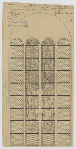 Opschrift: Ontwerp voor eene glasraam in de parochiale kerk te heyst op den berg. H. Lambertus - H. Donatus. Omschrijving plan: glasraam Datum KCML: deze informatie wordt niet vermeld op het archiefstuk Archiefnummer: A0715
