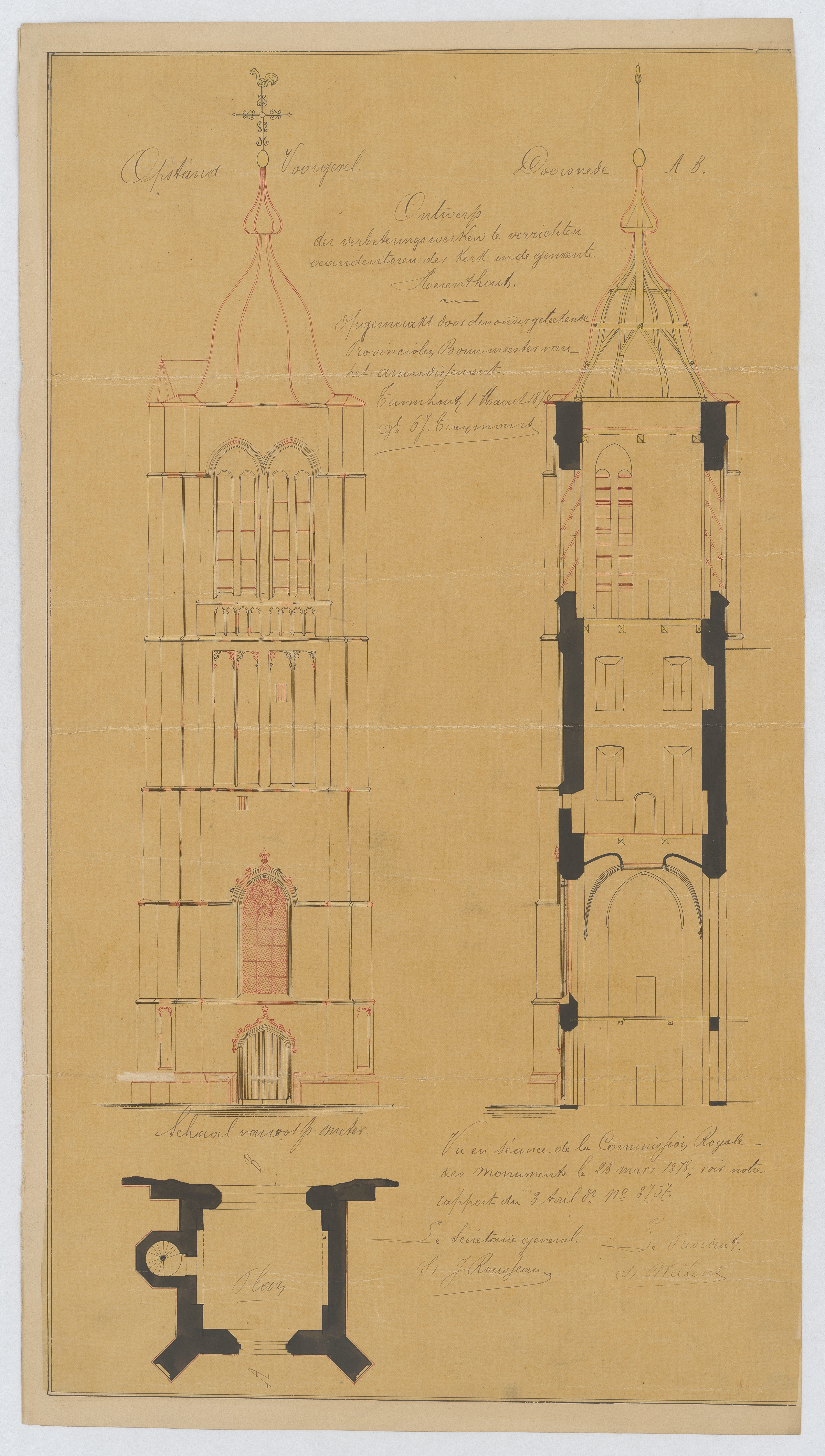 Opschrift: Ontwerp voor de verbeteringswerken te verrichten aan den toren der kerk in de gemeente Herenthout. Omschrijving plan: opstand voorgevel, plattegrond, opstand en doorsnede toren Datum KCML: 23/03/1878 Archiefnummer: A0766