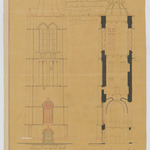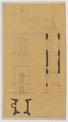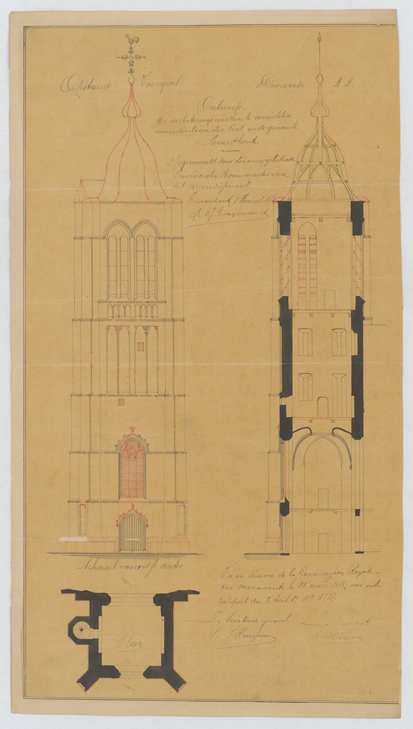 Opschrift: Ontwerp voor de verbeteringswerken te verrichten aan den toren der kerk in de gemeente Herenthout. Omschrijving plan: opstand voorgevel, plattegrond, opstand en doorsnede toren Datum KCML: 23/03/1878 Archiefnummer: A0766