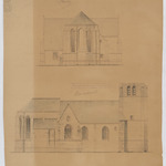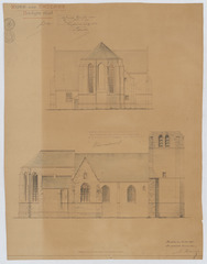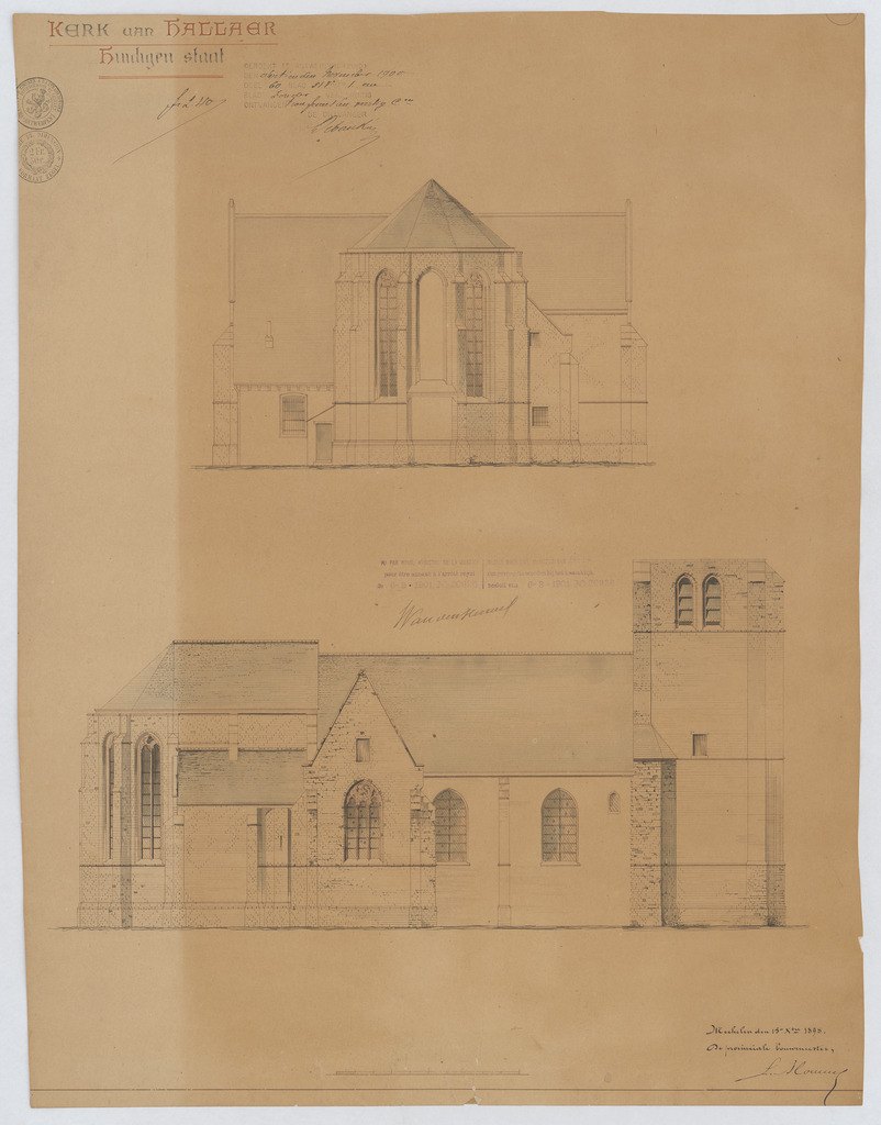 Opschrift: Kerk van Hallaer. Huidigen staat. Omschrijving plan: opstand achtergevel, opstand zijgevel Datum KCML: 30/09/1899 Archiefnummer: A0740