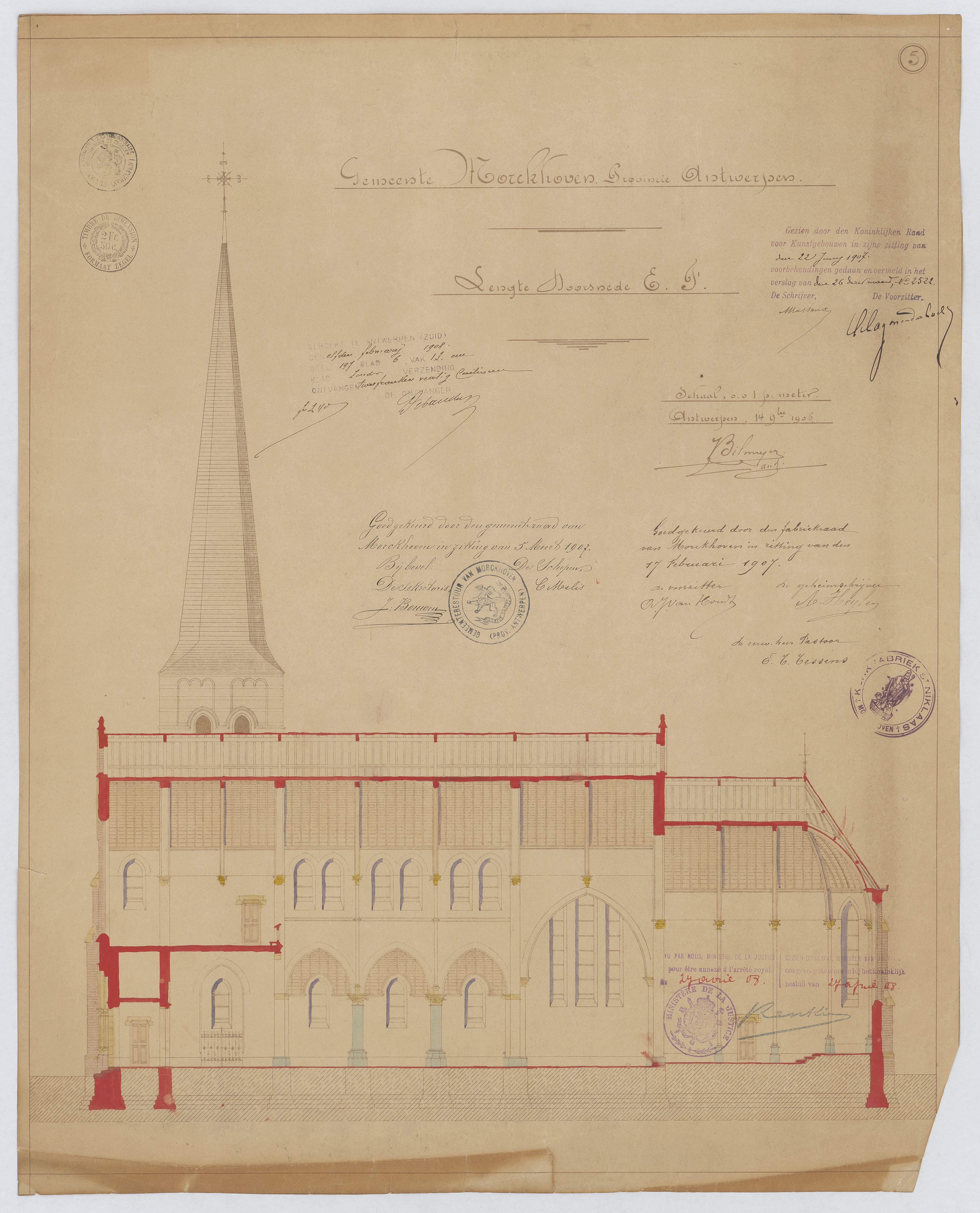 Opschrift: Gemeente Morckhoven. Provincie Antwerpen. Lengte Doorsnede E.F. Omschrijving plan: langsdoorsnede Datum KCML: 22/06/1907 Archiefnummer: A0757