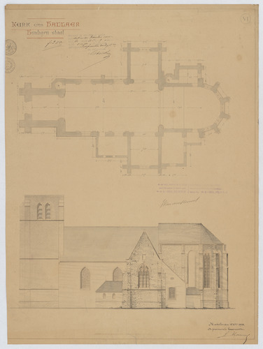 Opschrift: Kerk van Hallaer. Huidigen staat. Omschrijving plan: plattegrond niveau 0, opstand zijgevel Datum KCML: 30/09/1899 Archiefnummer: A0738