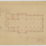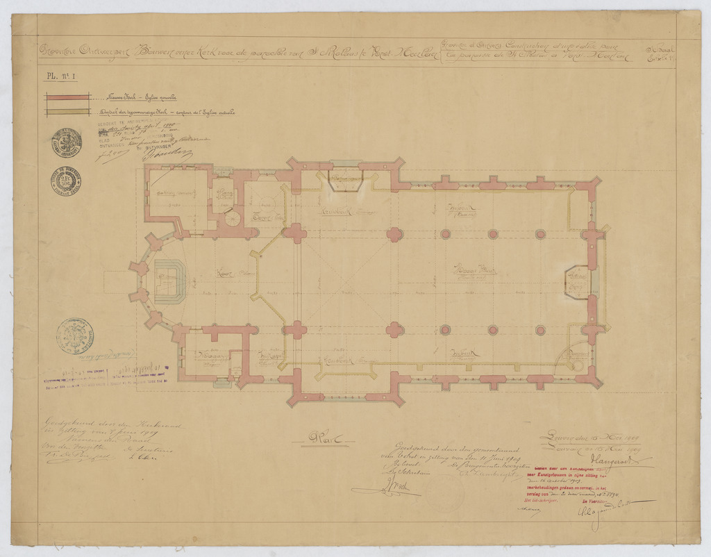 Opschrift: Provincie Antwerpen. Bouwen eener Kerk voor de parochie van St.-Nikolaas te Vorst-Meerlaer. Omschrijving plan: plattegrond niveau 0 Datum KCML: 16/10/1909 Archiefnummer: A0862