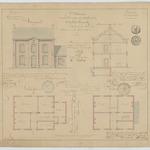 Opschrift: Ontwerp voor het bouwen eener pastorij te Achterbroeck. Omschrijving plan: opstand voorgevel, plattegrond niveau 0, plattegrond niveau 1, dwarsdoorsnede Datum KCML: 14/01/1871 Archiefnummer: A0822