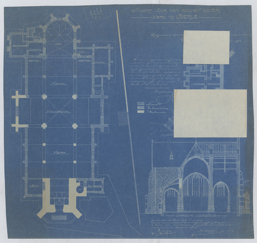 Opschrift: Ontwerp voor het bouwen eener kerk te Veerle. Omschrijving plan: plattegrond niveau 0, plattegrond niveau -1, dwarsdoorsnede naar het koor Datum KCML: 8 /03/1913 Archiefnummer: A0856_02