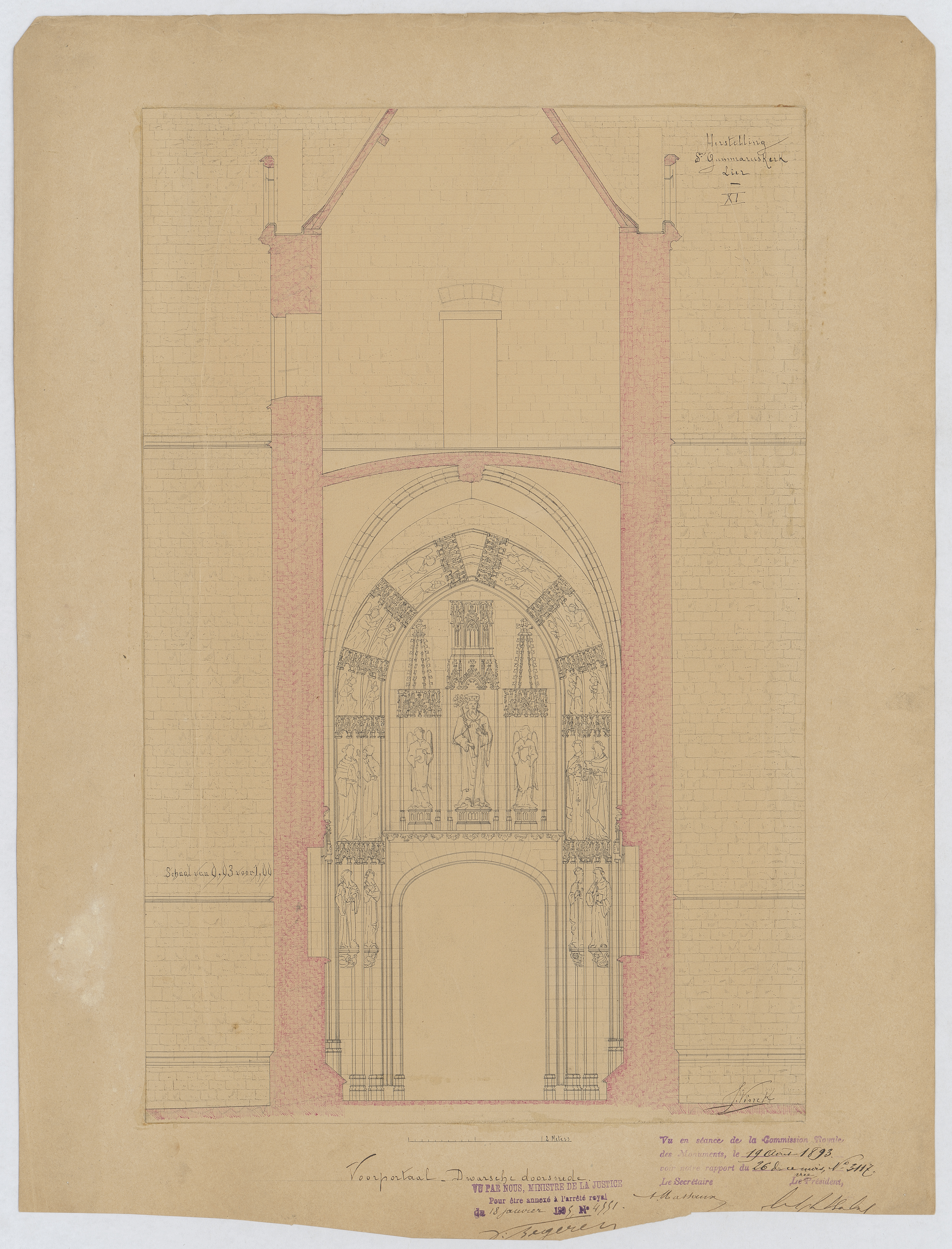 Opschrift: Herstelling St.-Gummaruskerk Lier. Omschrijving plan: dwarsdoorsnede, dwarsdoorsnede portaal Datum KCML: 19/08/1893 Archiefnummer: A0880
