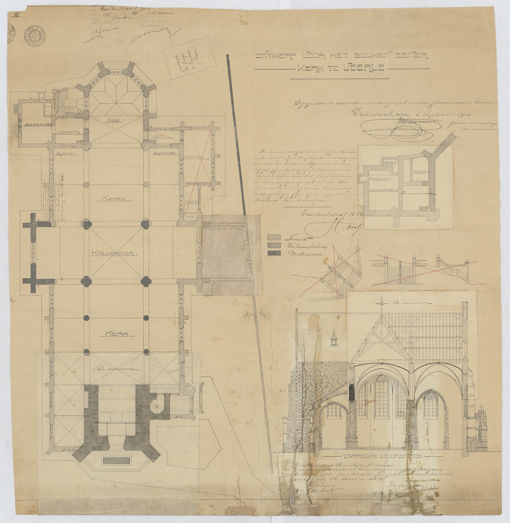 Opschrift: Ontwerp voor het bouwen eener kerk te Veerle. Omschrijving plan: plattegrond niveau 0, plattegrond niveau -1, dwarsdoorsnede naar het koor (aangepast ontwerp) Datum KCML: 8 /03/1913 Archiefnummer: A0853_01
