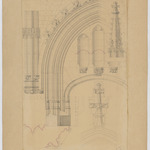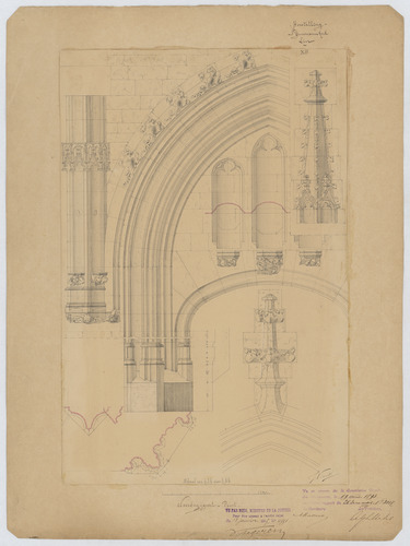 Opschrift: Herstelling St.-Gummaruskerk Lier. Omschrijving plan: aanzicht, doorsnede en details beeldhouwwerk portaal Datum KCML: 19/08/1893 Archiefnummer: A0881