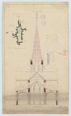 Opschrift: Kerk te Casterlé. Omschrijving plan: dwarsdoorsnede, situatieplan Datum KCML: 14/07/1894 Archiefnummer: A0843