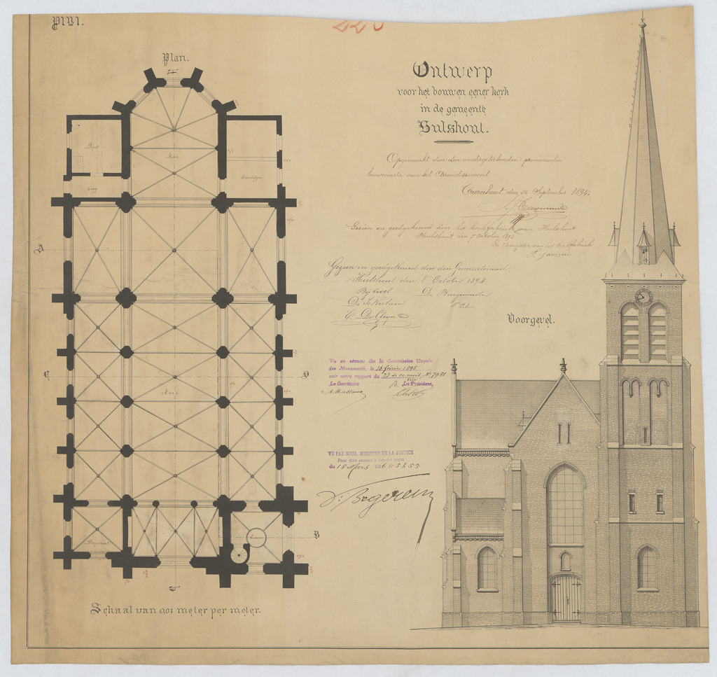 Opschrift: Ontwerp voor het bouwen eener kerk in de gemeente Hulshout. Omschrijving plan: plattegrond niveau 0, opstand voorgevel Datum KCML: 16/02/1895 Archiefnummer: A0807