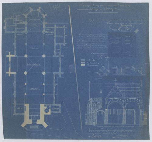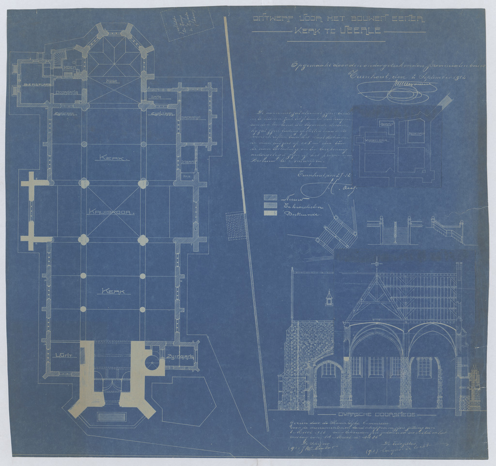 Opschrift: Ontwerp voor het bouwen eener kerk te Veerle. Omschrijving plan: plattegrond niveau 0, plattegrond niveau -1, dwarsdoorsnede naar het koor (aangepast ontwerp) Datum KCML: 8 /03/1913 Archiefnummer: A0856_01