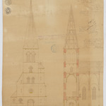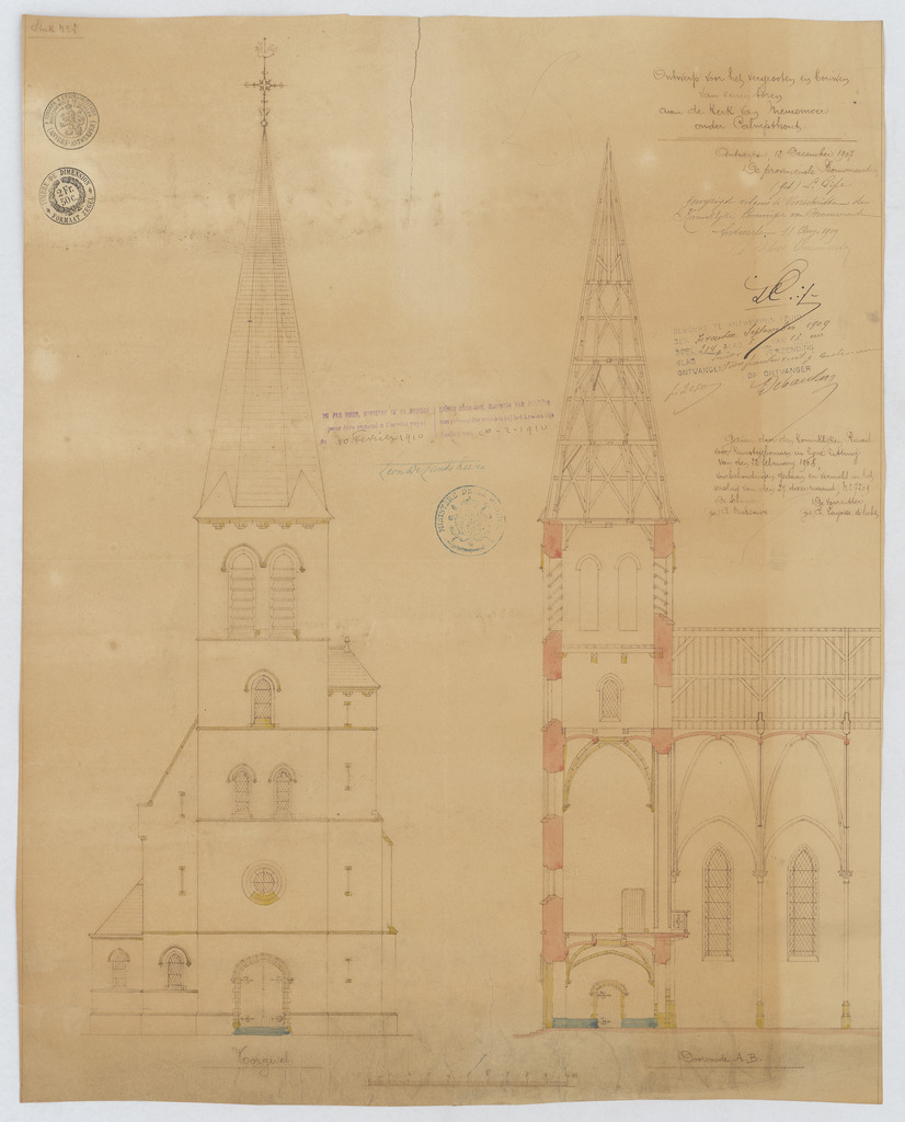 Opschrift: Ontwerp voor het vergrooten en bouwen van eenen toren aan de Kerk van Nieuwmoer onder Calmpthout. Omschrijving plan: opstand voorgevel, langsdoorsnede Datum KCML: 22/02/1908 Archiefnummer: A0824