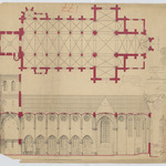 Opschrift: Ontwerp voor het bouwen eener kerk te Calmpthout. Omschrijving plan: plattegrond niveau 0, langsdoorsnede Datum KCML: 23/12/1893 Archiefnummer: A0814