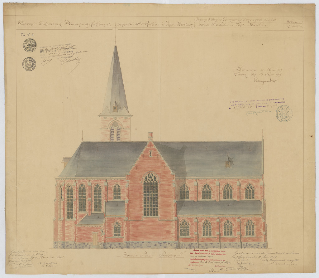 Opschrift: Provincie Antwerpen. Bouwen eener Kerk voor de parochie van St.-Nikolaas te Meerlaer. Omschrijving plan: opstand N-gevel Datum KCML: 16/10/1909 Archiefnummer: A0865