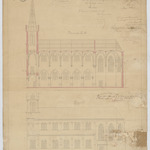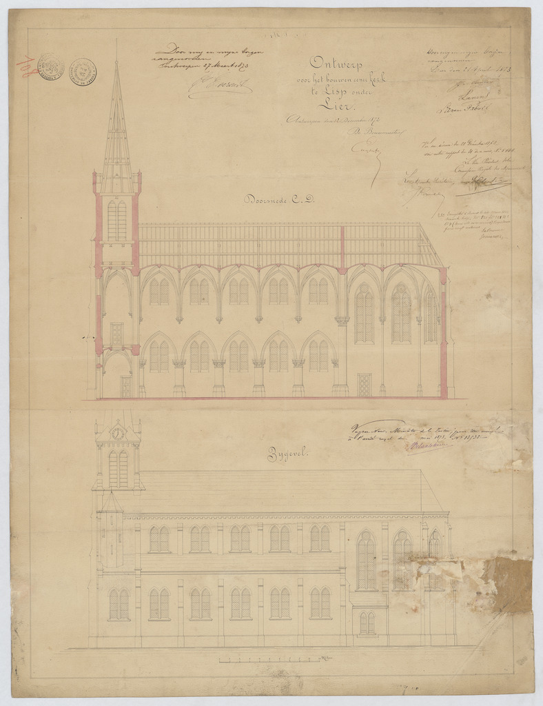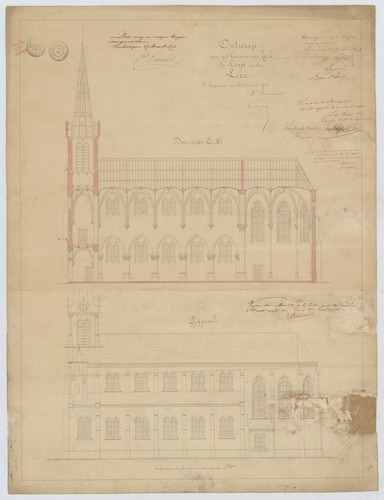Opschrift: Ontwerp voor het bouwen eener kerk te Lisp onder Lier. Omschrijving plan: opstand zijgevel 1, langsdoorsnede Datum KCML: 21/12/1872 Archiefnummer: A0895