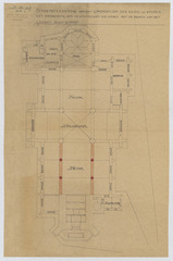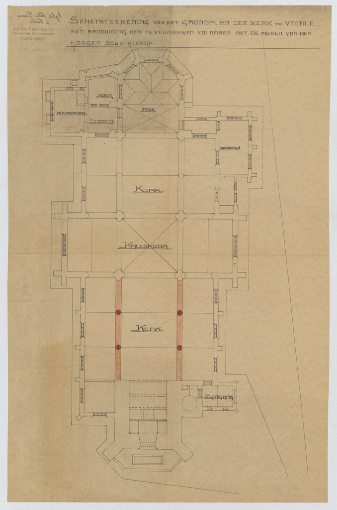 Opschrift: Schetsteekening van het grondplan der kerk te Veerle - met aanduiding der te vernieuwen kolommen met de muren van den hoogen beuk hierop. Omschrijving plan: plattegrond niveau 0 Datum KCML: deze informatie wordt niet vermeld op het archiefstuk Archiefnummer: A0860