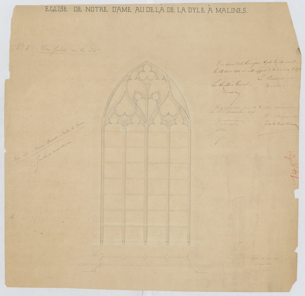 Opschrift: Eglise de Notre Dame au de la Dyle à Malines. Omschrijving plan: aanzicht en doorsnede venster Datum KCML: 26/08/1876 Archiefnummer: A0922