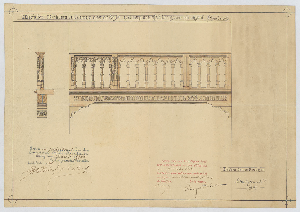 Opschrift: Mechelen. Kerk van O.L.Voruw over de Dijle. Ontwerp van afsluiting voor het okzaal. Omschrijving plan: vooraanzicht en doorsnede doksaal Datum KCML: 14/10/1905 Archiefnummer: A0926