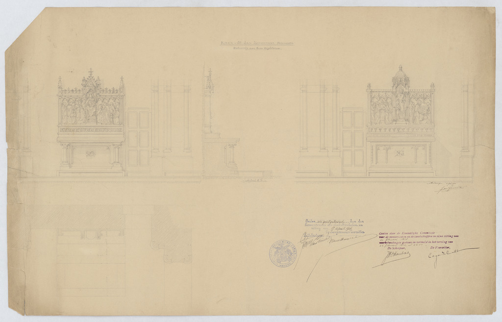 Opschrift: Kerk St Jan Berchmans - Mechelen. Ontwerp voor twee zijaltaren. Omschrijving plan: plattegrond en vooraanzicht zijaltaren Datum KCML: 24/02/1914 Archiefnummer: A0965