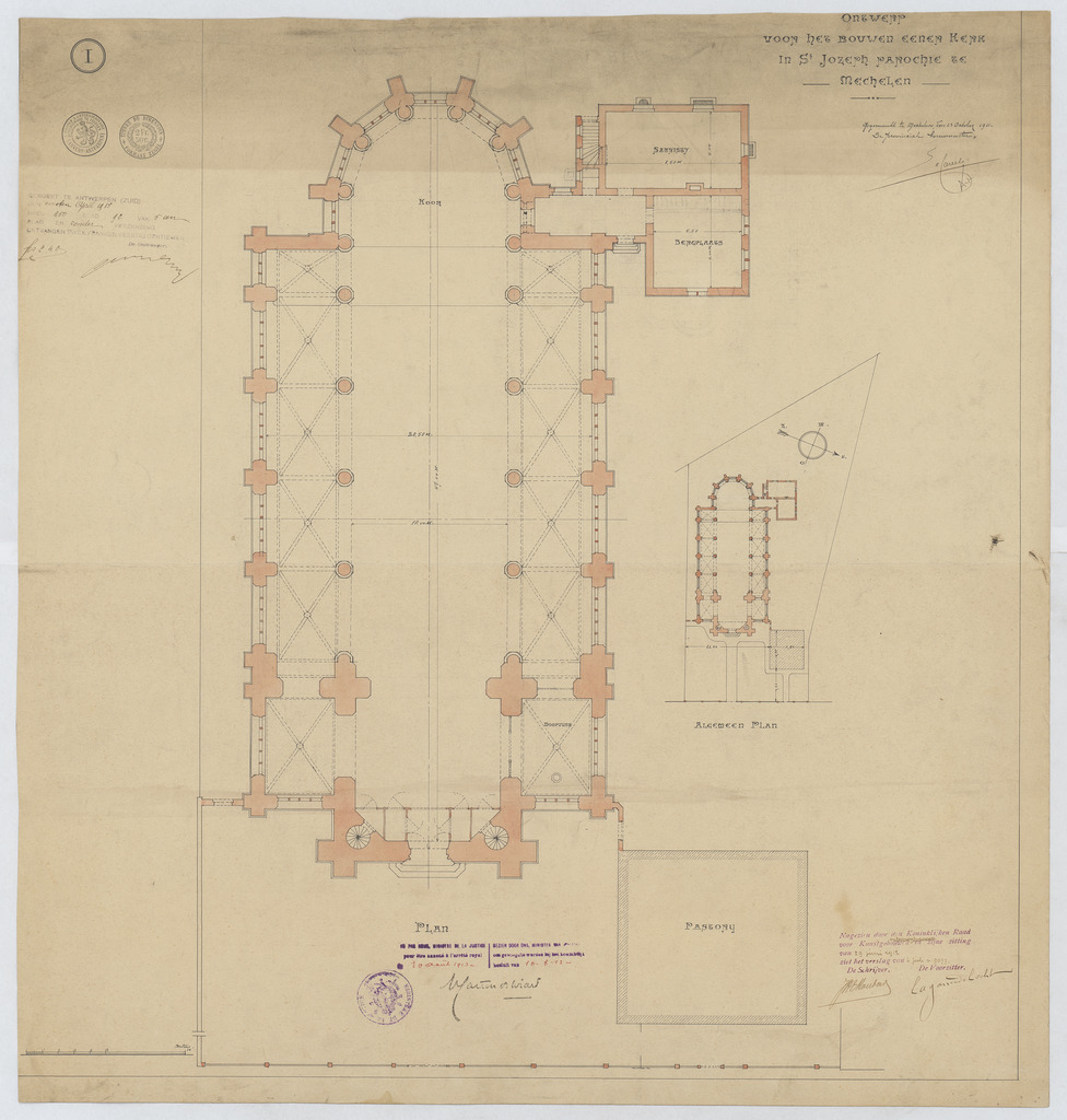 Opschrift: Ontwerp voor het bouwen eener kerk in St. Jozeph parochie te Mechelen. Omschrijving plan: plattegrond niveau 0, situatieplan Datum KCML: 29/06/1912 Archiefnummer: A0966