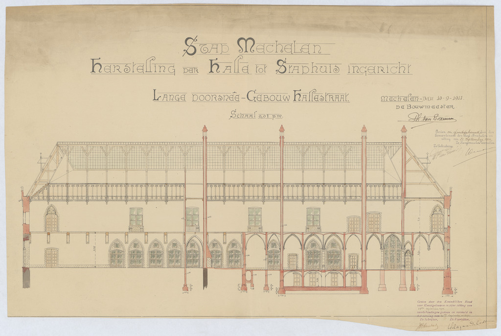 Opschrift: Stad Mechelen. Herstelling der Halle tot stadhuis ingericht. Omschrijving plan: langsdoorsnede, langsdoorsnede gebouw Hallestraat Datum KCML: 23/09/1911 Archiefnummer: A0994