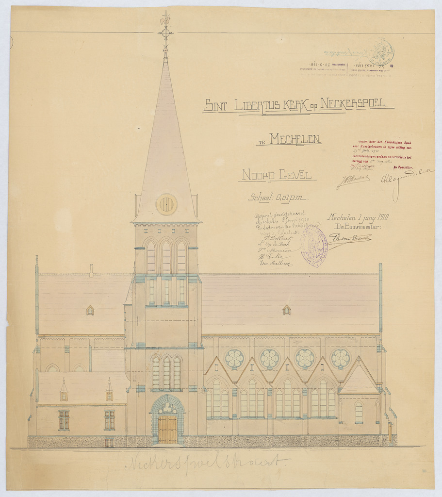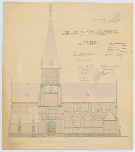 Opschrift: Sint Libertus kerk op Nekkerspoel te Mechelen. Omschrijving plan: opstand N-gevel Datum KCML: 29/07/1910 Archiefnummer: A1006