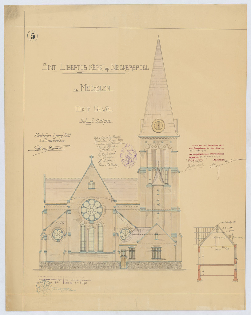 Opschrift: Sint Libertus kerk op Nekkerspoel te Mechelen. Omschrijving plan: opstand O-gevel Datum KCML: 29/07/1910 Archiefnummer: A1008