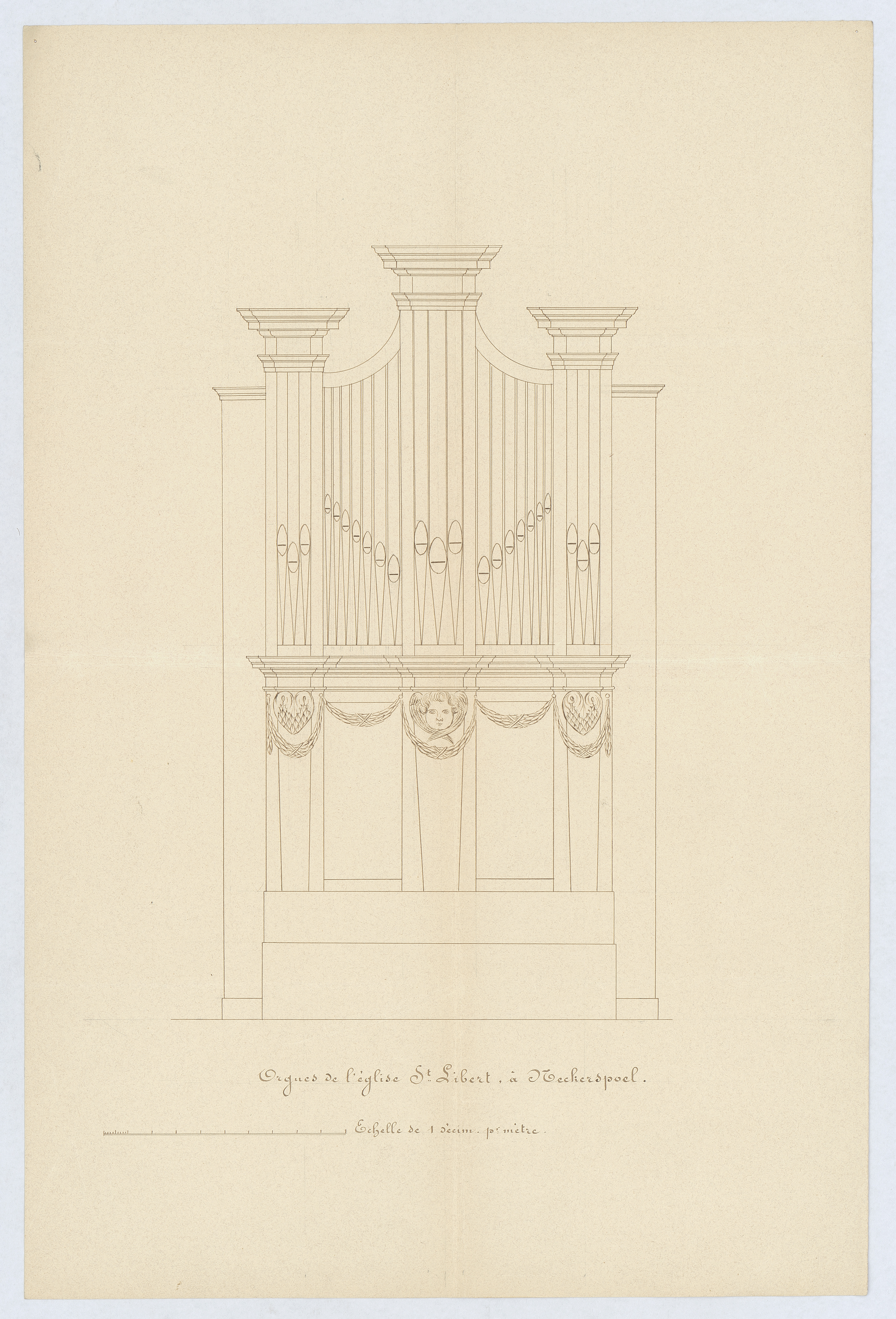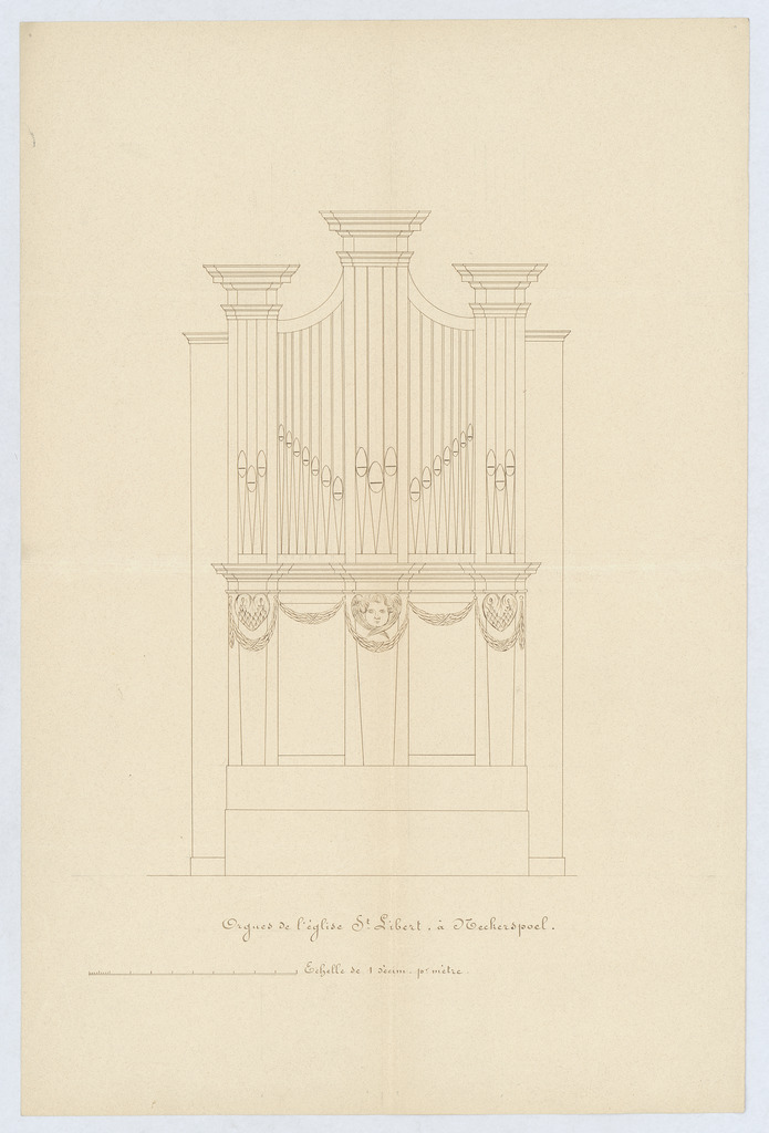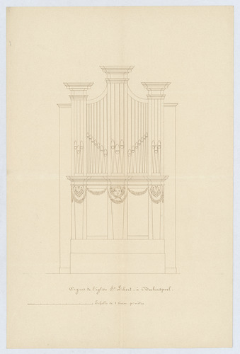 Opschrift: Orgues de l'église St. Libert, à Neckerspoel. Omschrijving plan: aanzicht orgelkast Datum KCML: deze informatie wordt niet vermeld op het archiefstuk Archiefnummer: A1012
