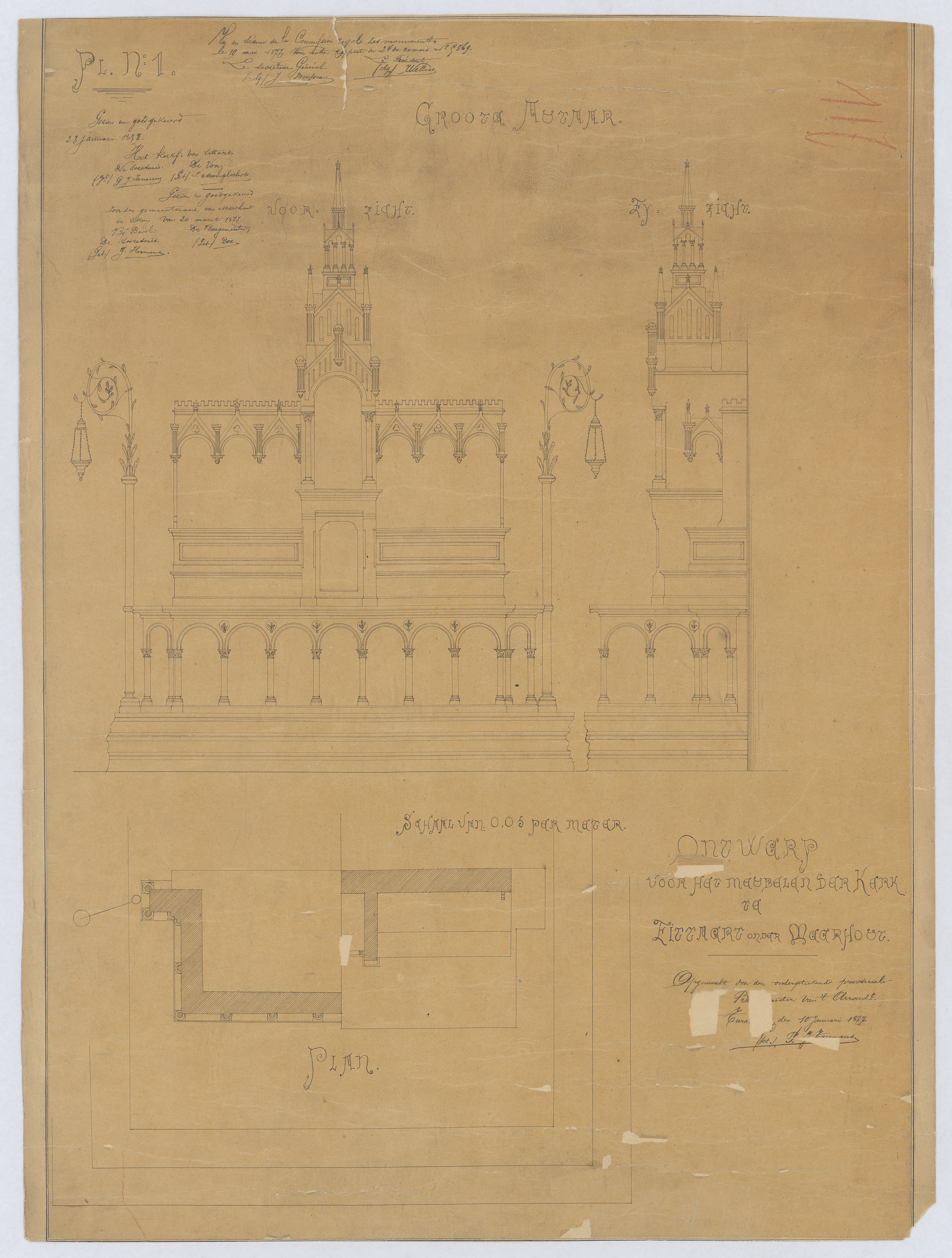 Opschrift: Ontwerp voor het meubelen der kerk te Zittaart onder Meerhout. Omschrijving plan: plattegrond, voor- en zijaanzicht hoofdaltaar Datum KCML: 19/05/1877 Archiefnummer: A1026