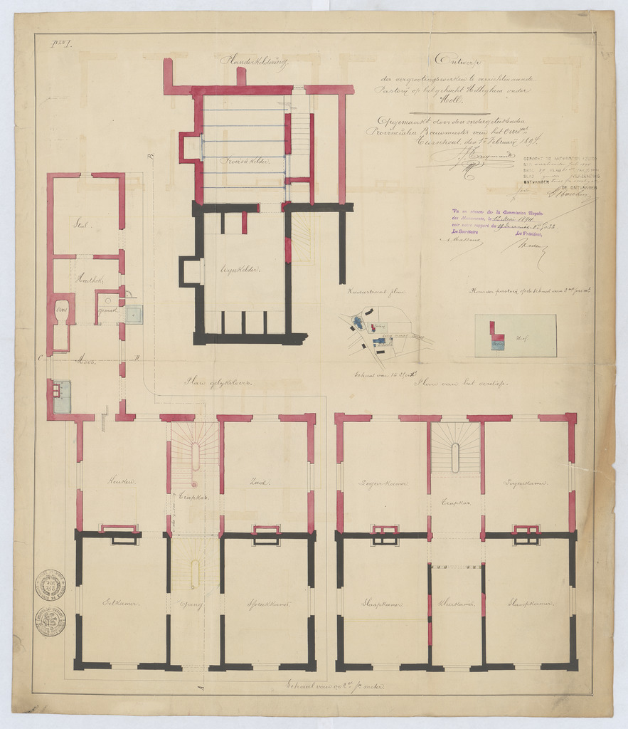 Opschrift: Ontwerp der vergrootingswerlen te verrichten aande Pastorij op het gehucht Milleghem onder Moll. Omschrijving plan: plattegrond niveau 0, plattegrond niveau -1, plattegrond niveau 1, situatieplan Datum KCML: 12/05/1894 Archiefnummer: A1044