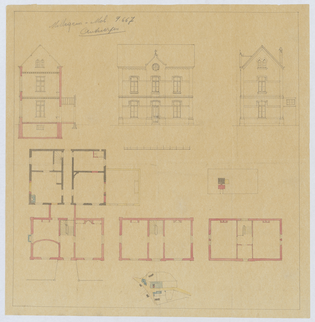 Opschrift: deze informatie wordt niet vermeld op het archiefstuk Omschrijving plan: opstand voorgevel, opstand zijgevel, plattegronden, doorsnede, situatieplan Datum KCML: deze informatie wordt niet vermeld op het archiefstuk Archiefnummer: A1046