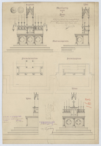 Opschrift: Meubleering der kerk te Rauw. Omschrijving plan: plattegrond, voor- en zijaanzicht hoofd- en zijaltaar Datum KCML: 9 /09/1893 Archiefnummer: A1050