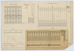 Opschrift: Meubleering der kerk te Rauw. Omschrijving plan: plattegrond, vooraanzicht en dwarsdoorsnede sacristiekast, plattegrond en vooraanzicht balustrade doksaal, aanzicht afsluithek (aangepast ontwerp) Datum KCML: 9 /09/1893 Archiefnummer: A1053_01