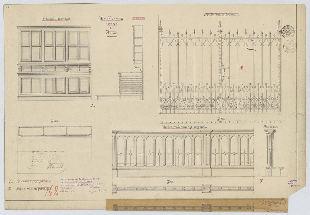 Opschrift: Meubleering der kerk te Rauw. Omschrijving plan: plattegrond, vooraanzicht en dwarsdoorsnede sacristiekast, plattegrond en vooraanzicht balustrade doksaal, aanzicht afsluithek Datum KCML: 9 /09/1893 Archiefnummer: A1053_02