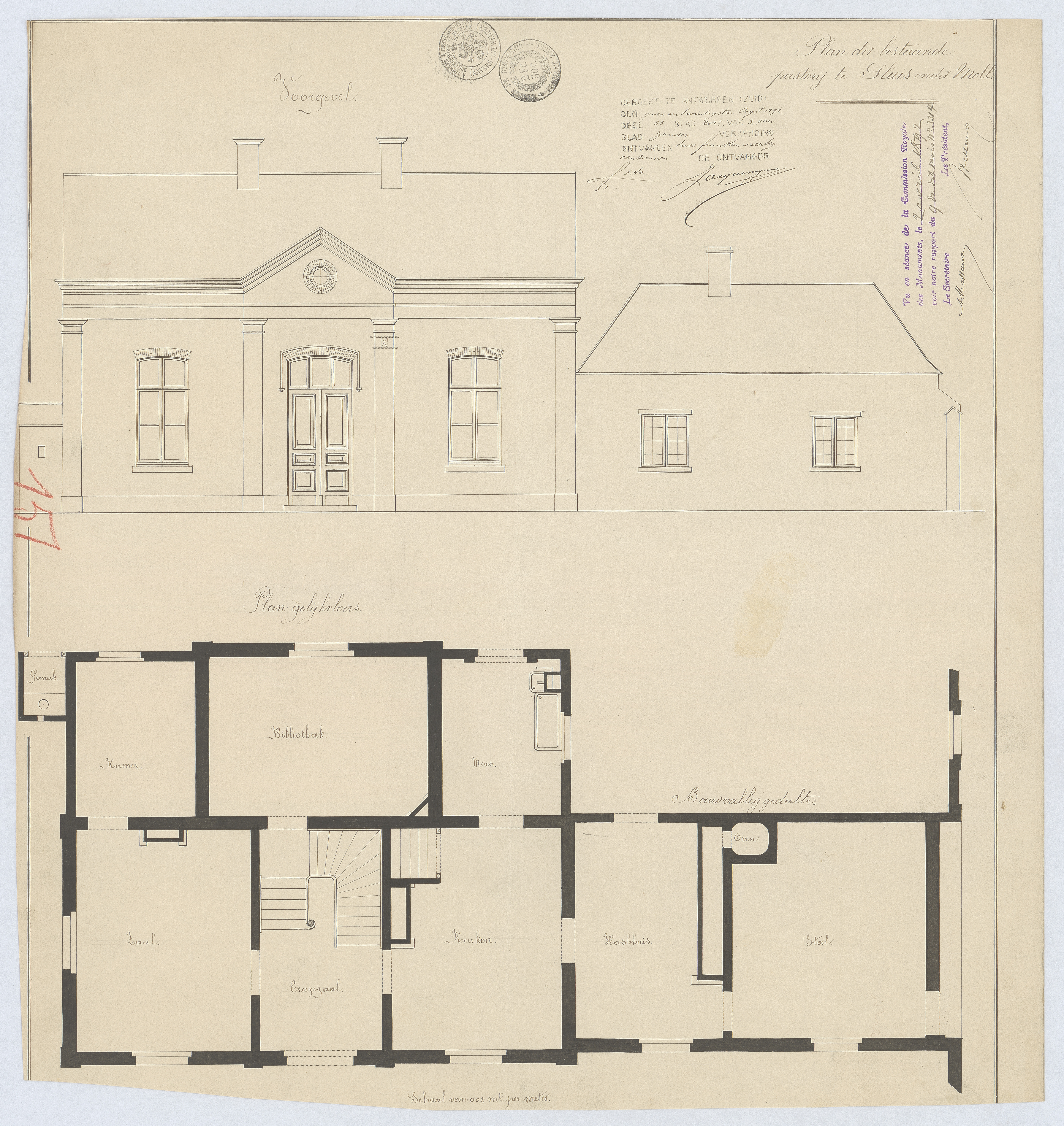 Opschrift: Plan der bestaande pastorij te Sluis onder Moll. Omschrijving plan: opstand voorgevel, plattegrond niveau 0 Datum KCML: 2 /04/1892 Archiefnummer: A1062